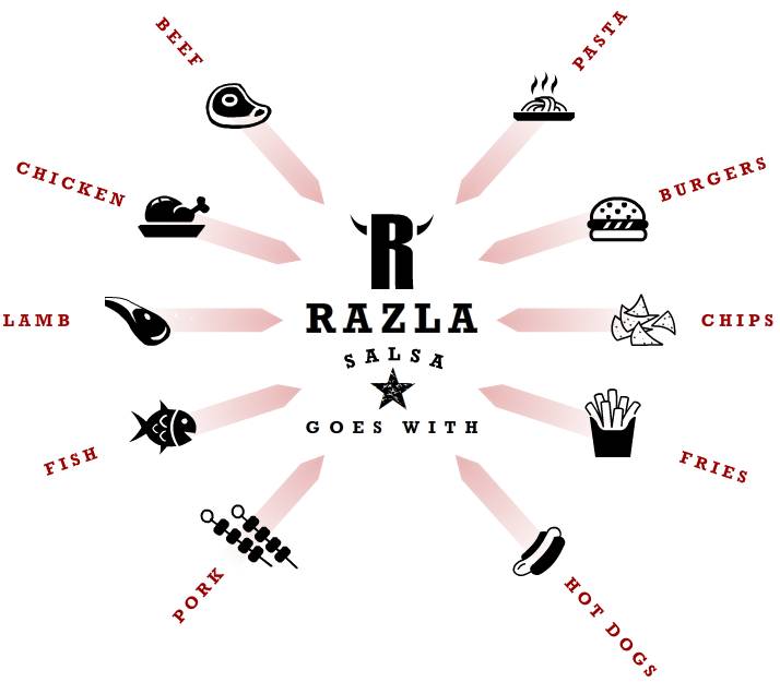Razla enhances the taste of almost every food group, including meats such as steaks, chicken, lamb, pork, fish; snacks such as burgers and hotdogs; dips including nachos, crisps and fries. It even works as a marinade, and stir-in sauce for rice or pasta. Once you try Razla, you'll wonder how you ever managed without it! Created by Richard and Helen Deehan while travelling across Europe on a decade-long extended 'gap year', Razla is a new kind of condiment - a cross between a salsa and a relish!